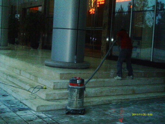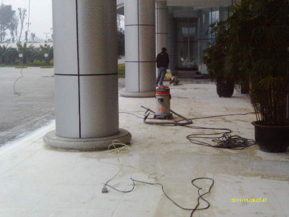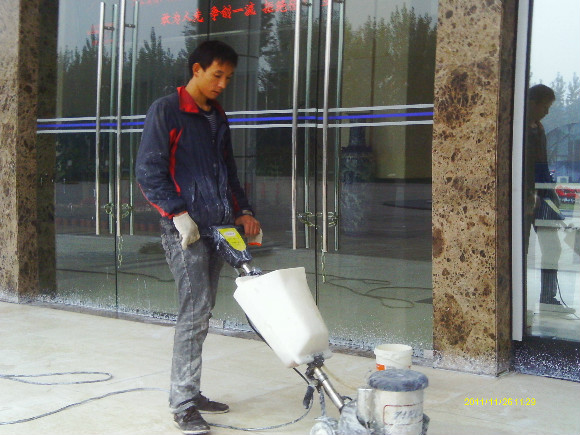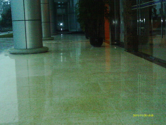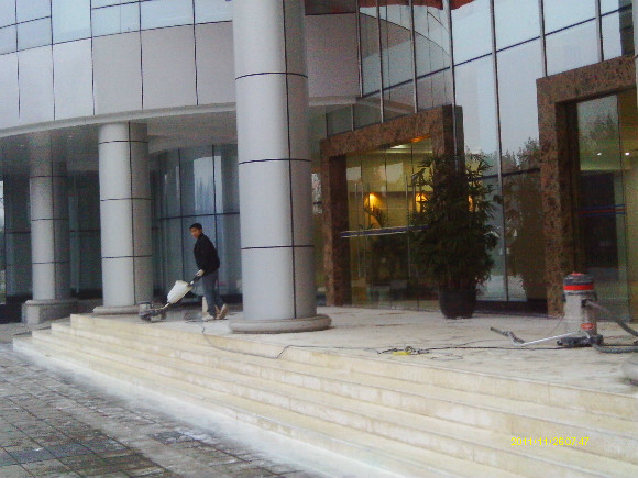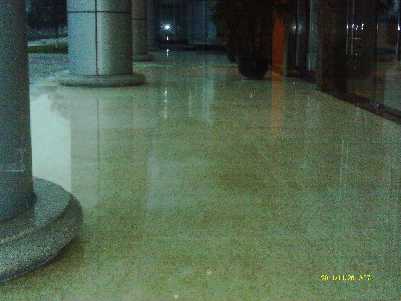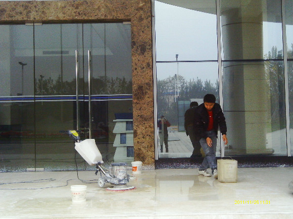 到了70年代末,一種可塑性水溶性結(jié)晶聚合物的誕生,亦即是現(xiàn)今常說的水蠟,進化了石材護理的歷史,可以利用這種物質(zhì)對不同材質(zhì)的大理石進行護理。分底蠟(封蠟),面蠟(拋光蠟)及保養(yǎng)蠟(日常修補蠟)是對大理石的塑層進行保護并利用高速拋光來增亮,對石材的保護起到一定的作用。但是這種水蠟不足之處是蠟層的硬度有限,稍欠保養(yǎng),腳步帶進的塵土將很容易把蠟層及石材磨花。同時,遇上雨水季節(jié),因室外雨水塵埃會有一定的雜質(zhì),通過人的腳步帶進后,對蠟層的分子組成將造成一定的影響。直觀看到是蠟層變黃及缺光澤,也就是以后常見到的許多客戶為什么須經(jīng)常將腐蝕的蠟層用起蠟水脫去,再重新分工序打上底蠟和面蠟,每次的工作量及耗用的物料較大,這種工藝現(xiàn)市場上很普通,我們稱為石材打蠟第二代。